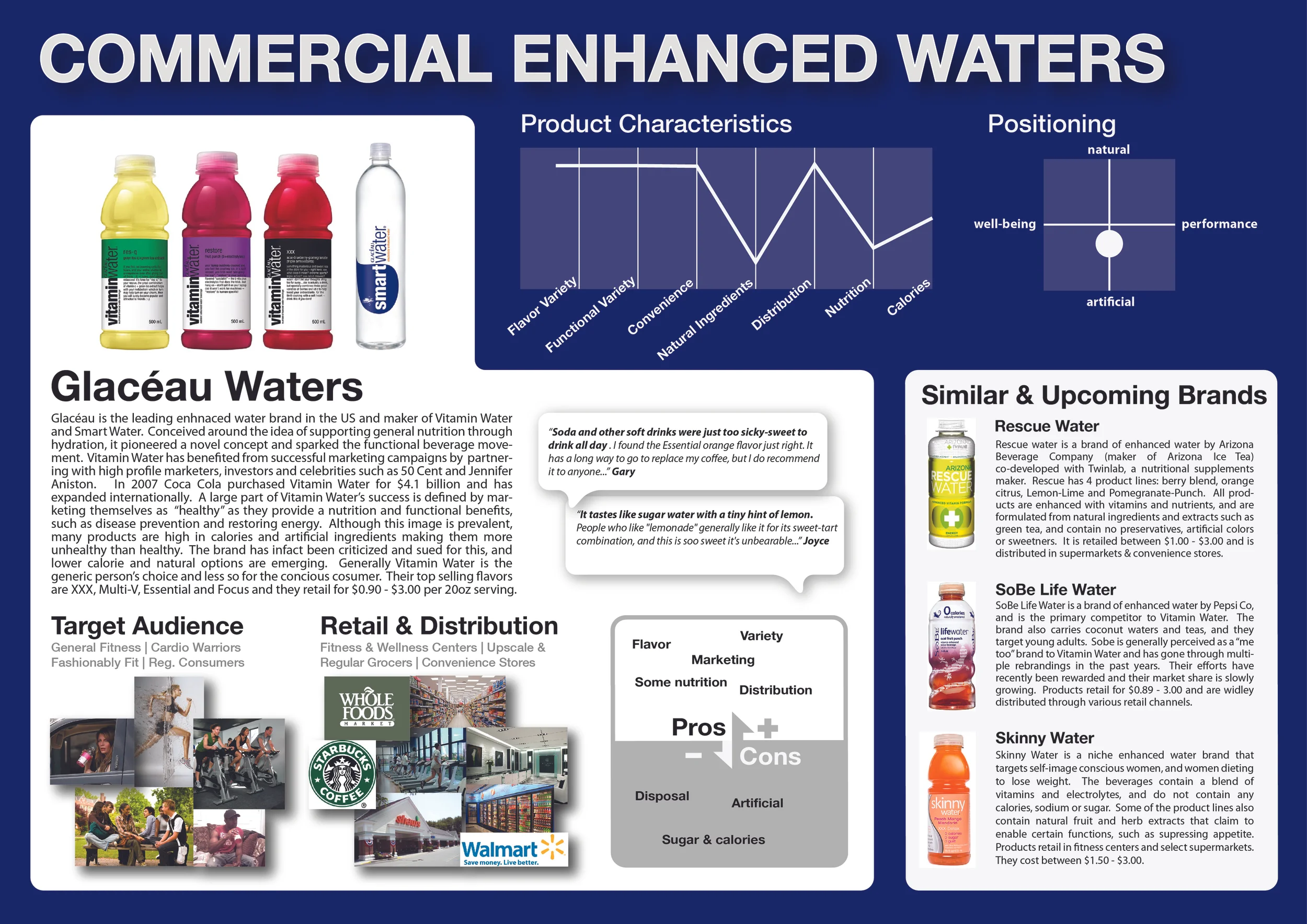 After gaining insight from our users, we wanted to gather additional intelligence about the beverage brands they liked - essentially who we could ultimately compete against. We looked at a variety of different drinks in the functional, sports, organic and tea space; turned them each into profiles; and mapped them in a matrix to identify white spaces and where we could position ourselves. We also looked at other reusable bottle brands to determine what design elements users liked and/or didn’t like to fuel our design and aesthetic efforts.